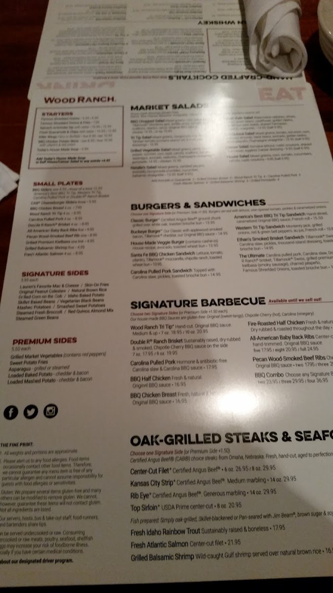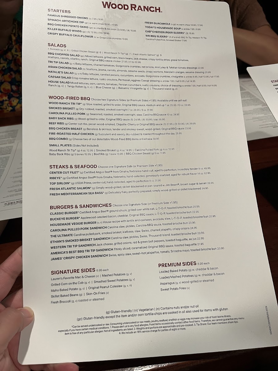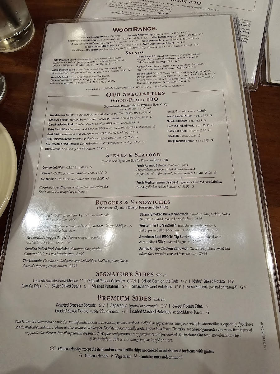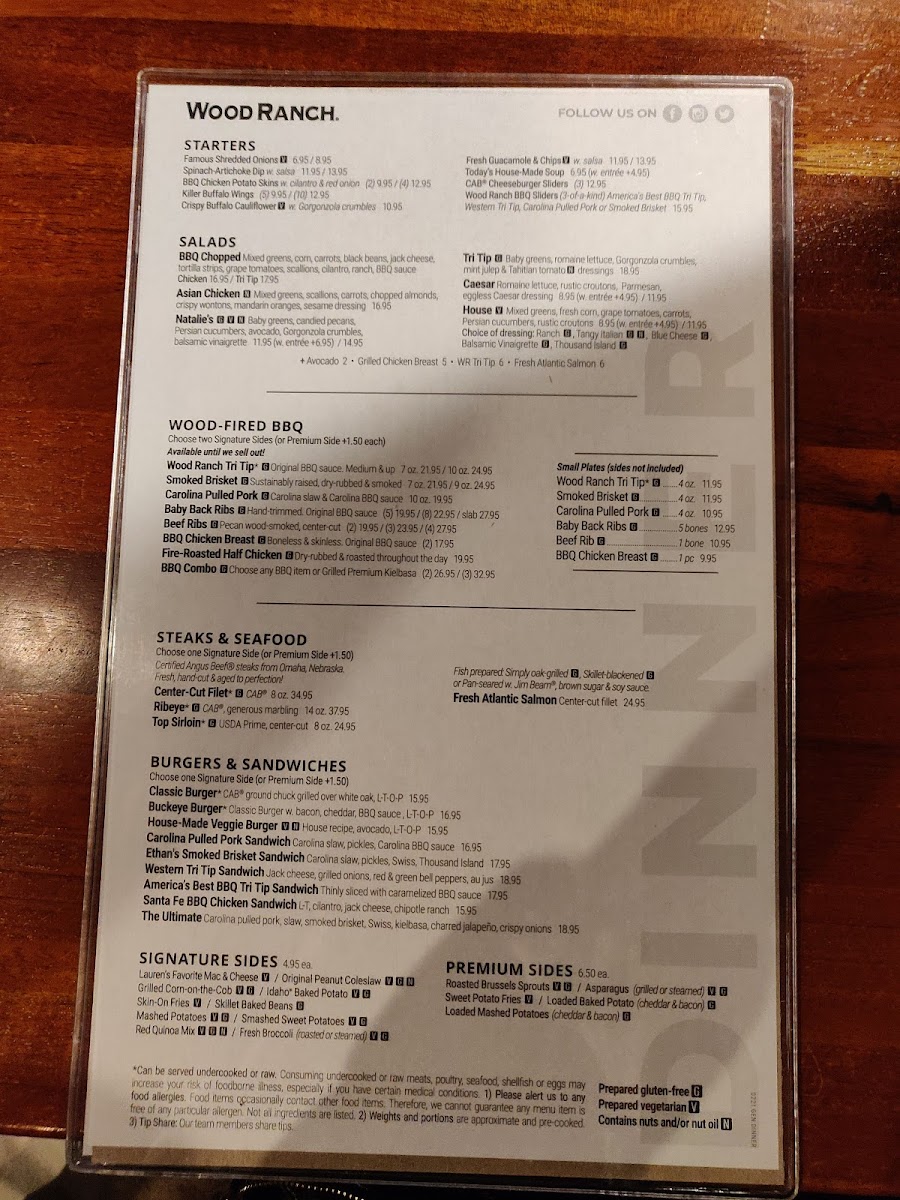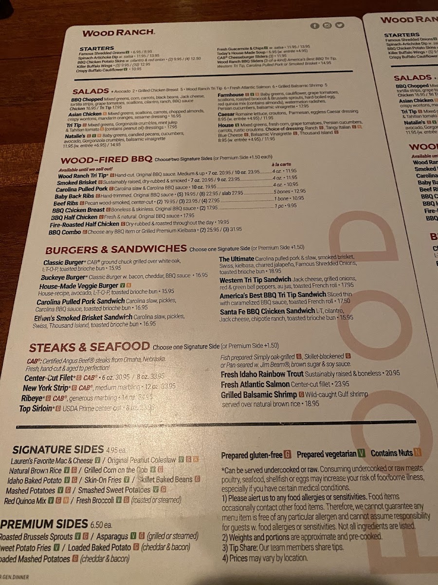 Wood-Fired BBQ encompasses a selection of smoked and grilled meats such as the Wood Ranch Tri Tip, Baby Back Ribs, Beef Ribs, and Smoked Brisket. These items are characterized by distinct seasoning and finishing sauces, providing traditional barbecue flavors. Portions and cuts vary, with options like hand-trimmed ribs and sustainably raised brisket.