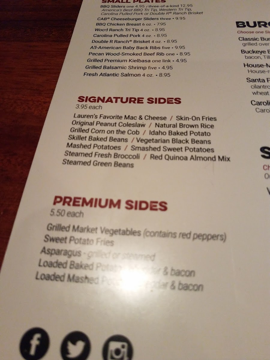 Signature Sides complement the main courses with choices such as Fresh Grilled White Corn, Idaho Baked Potato, Mashed Potatoes, Smashed Sweet Potatoes, BBQ Baked Beans, Macaroni & Cheese, and the Original Peanut Coleslaw. Some sides include allergens such as nuts or nut oils, which are indicated on the menu.